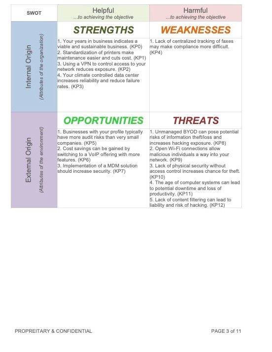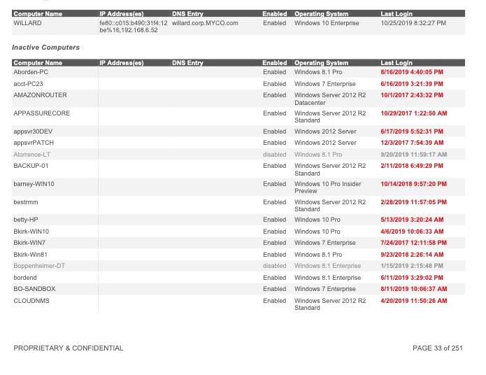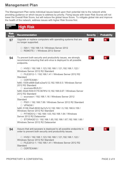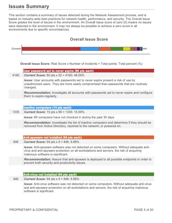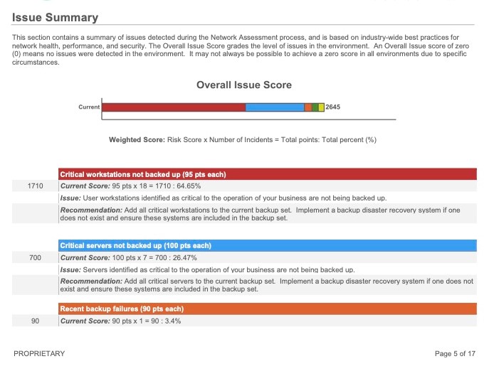 Our audit will pull hundreds of pages of network activity and configuration data. Problem areas are highlighted in red.
